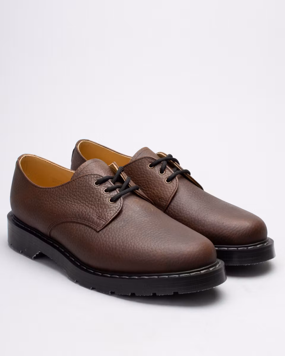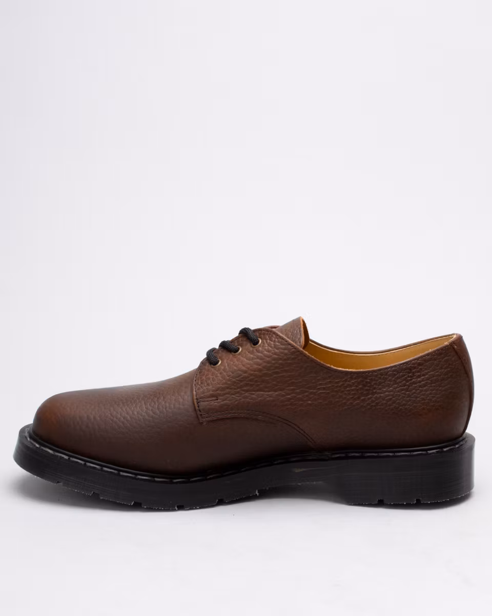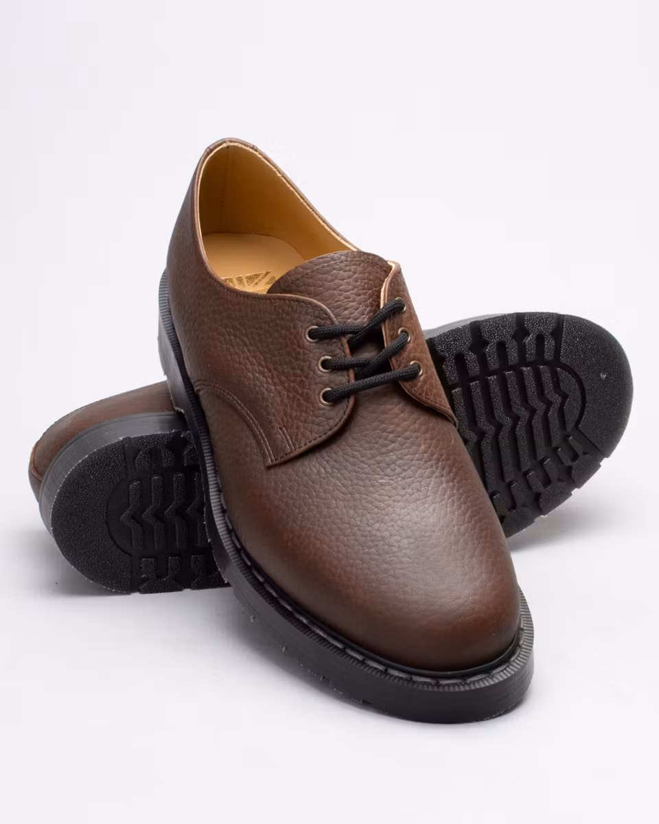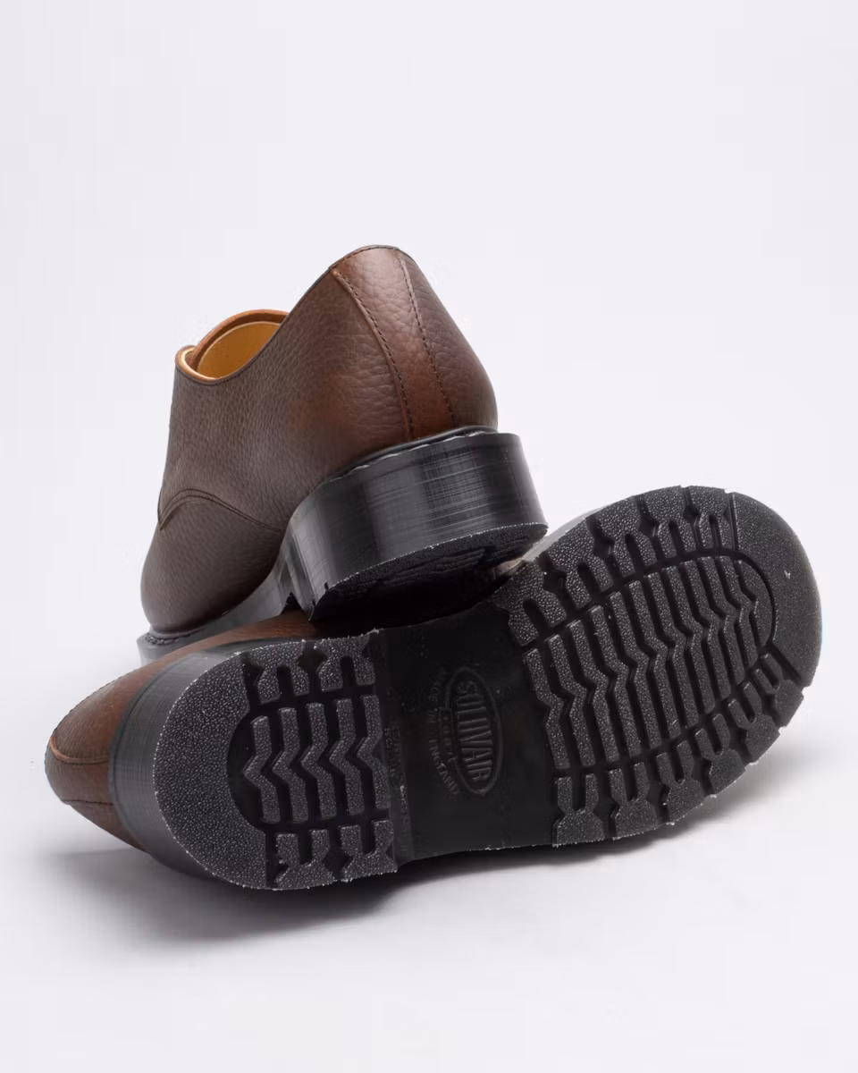 Derby shoe with upper in brown, embossed leather. Leather and textile lining. Leather insole. Rubber outsole with air cushions for maximum comfort. Goodyear welt construction. Made in England. Standard width last, F.
