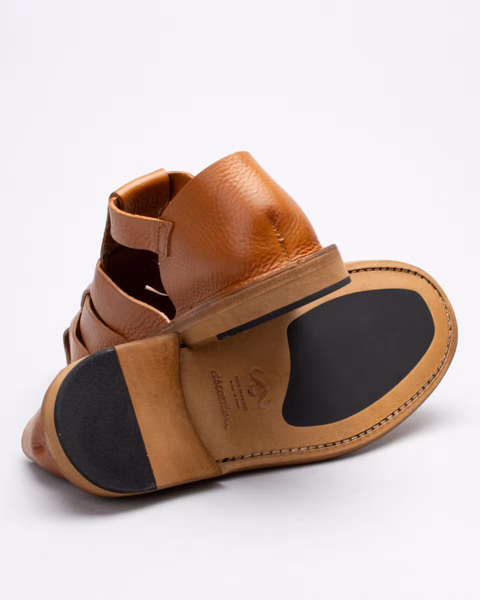 Monkflex is a classic leather sandal from the Italian manufacturer Astorflex. Upper in light brown calf leather. Unlined. Leather insole. Hybrid outsole in leather and rubber. Stitch-down construction. Made in Italy.