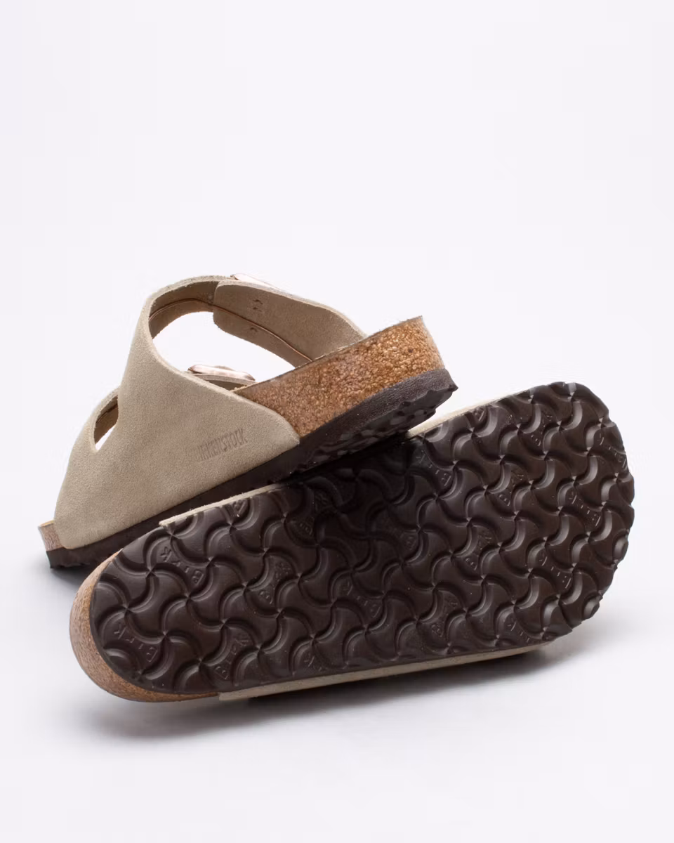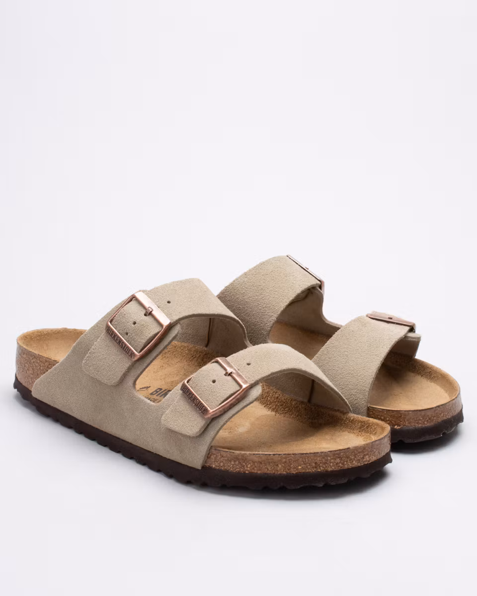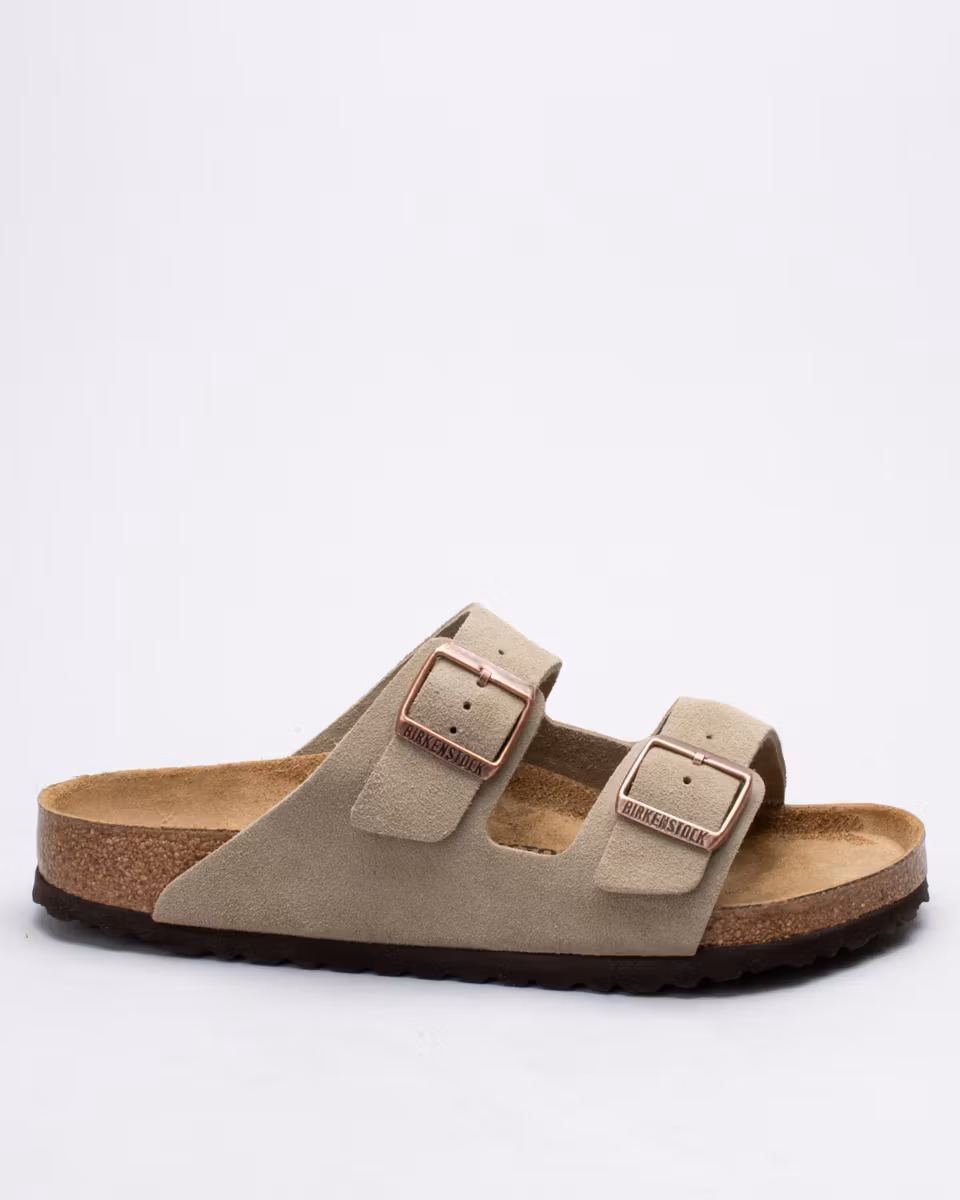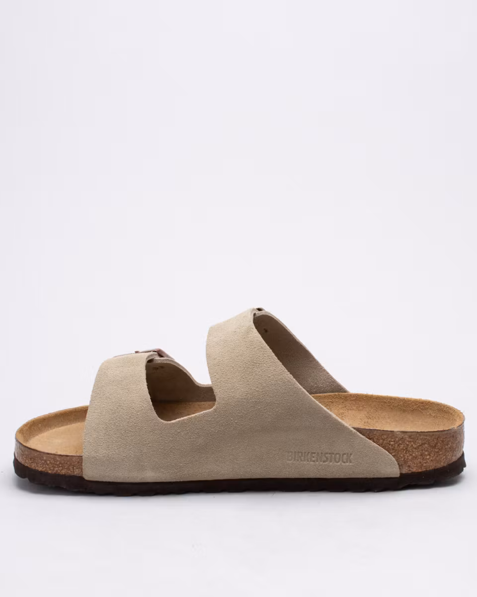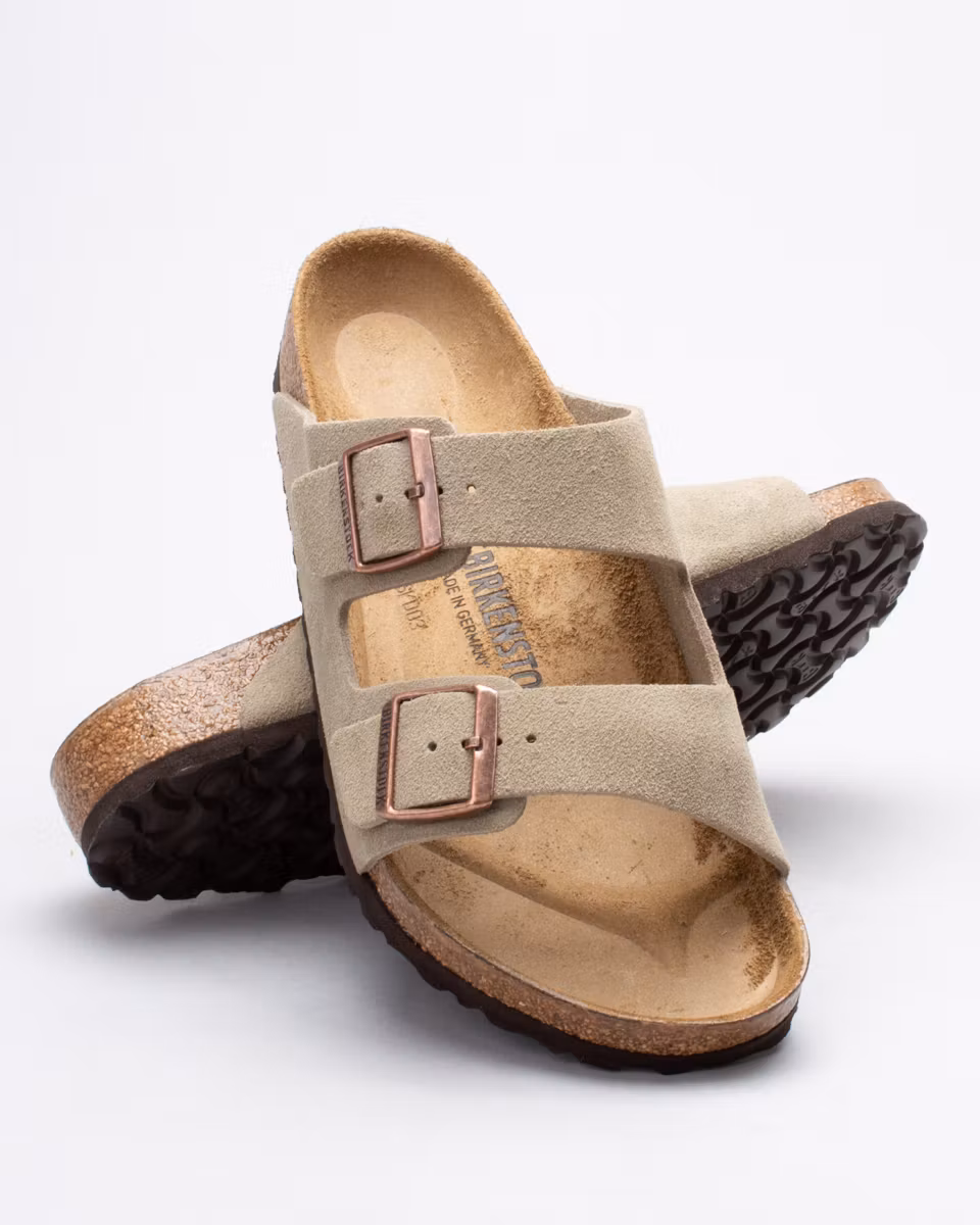 The Arizona is the classic 2-strap sandal from Birkenstock. Upper in taupe suede. Leather insole. Natural cork footbed. EVA rubber outsole. Normal width. Made in Germany.