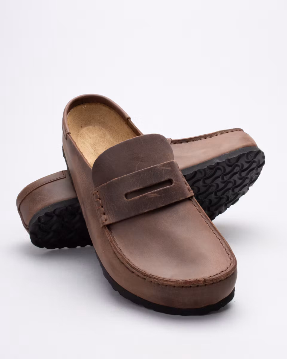 . Upper in dark brown oiled leather. Firm cork footbed lined with leather. Regular fit. Made in Germany.