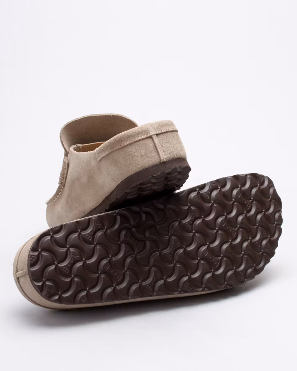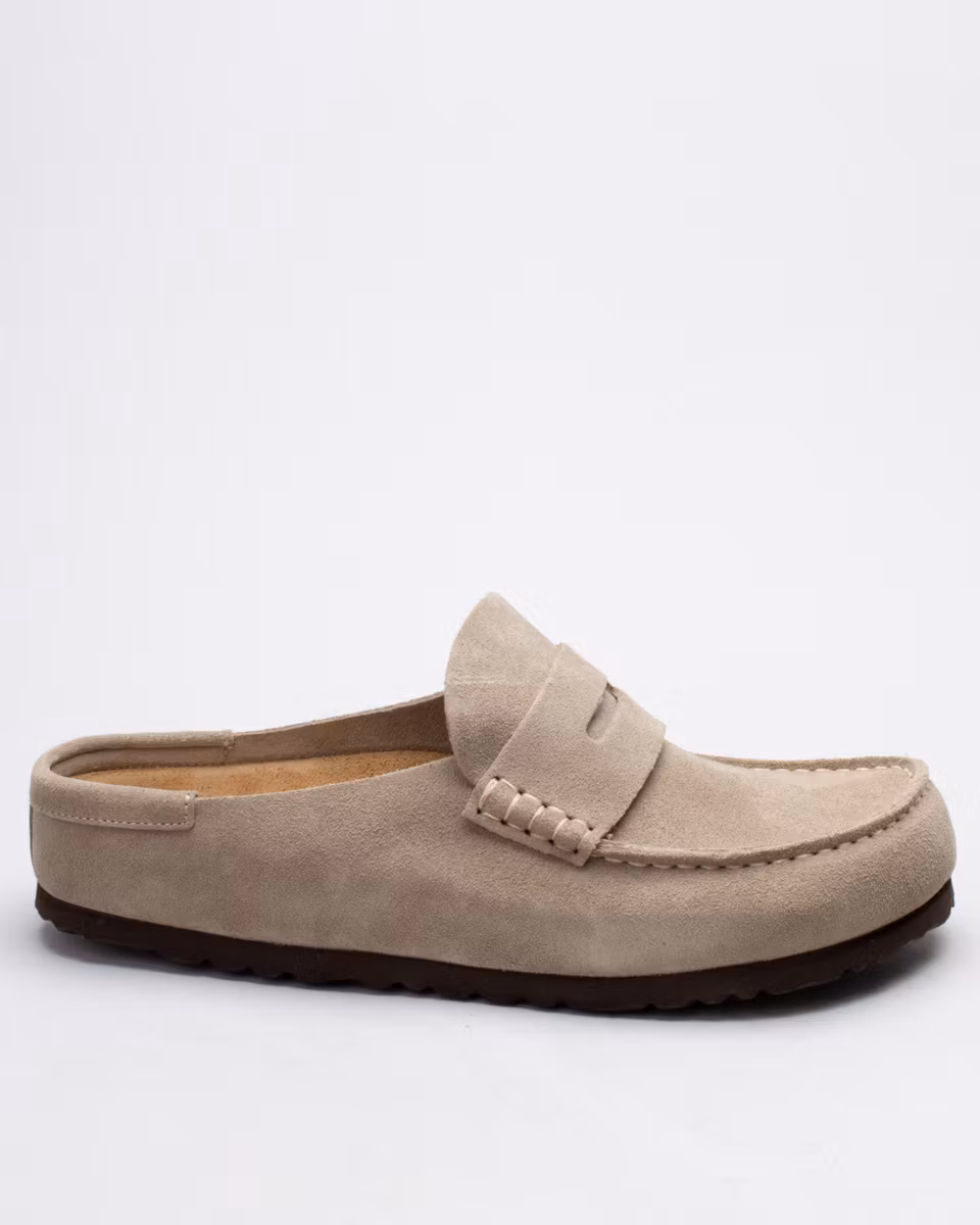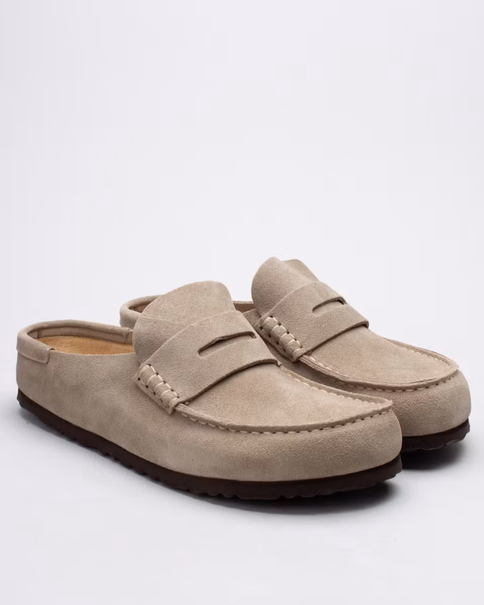 . Upper in light grey suede. Firm cork footbed lined with leather. Narrow fit. Made in Germany.