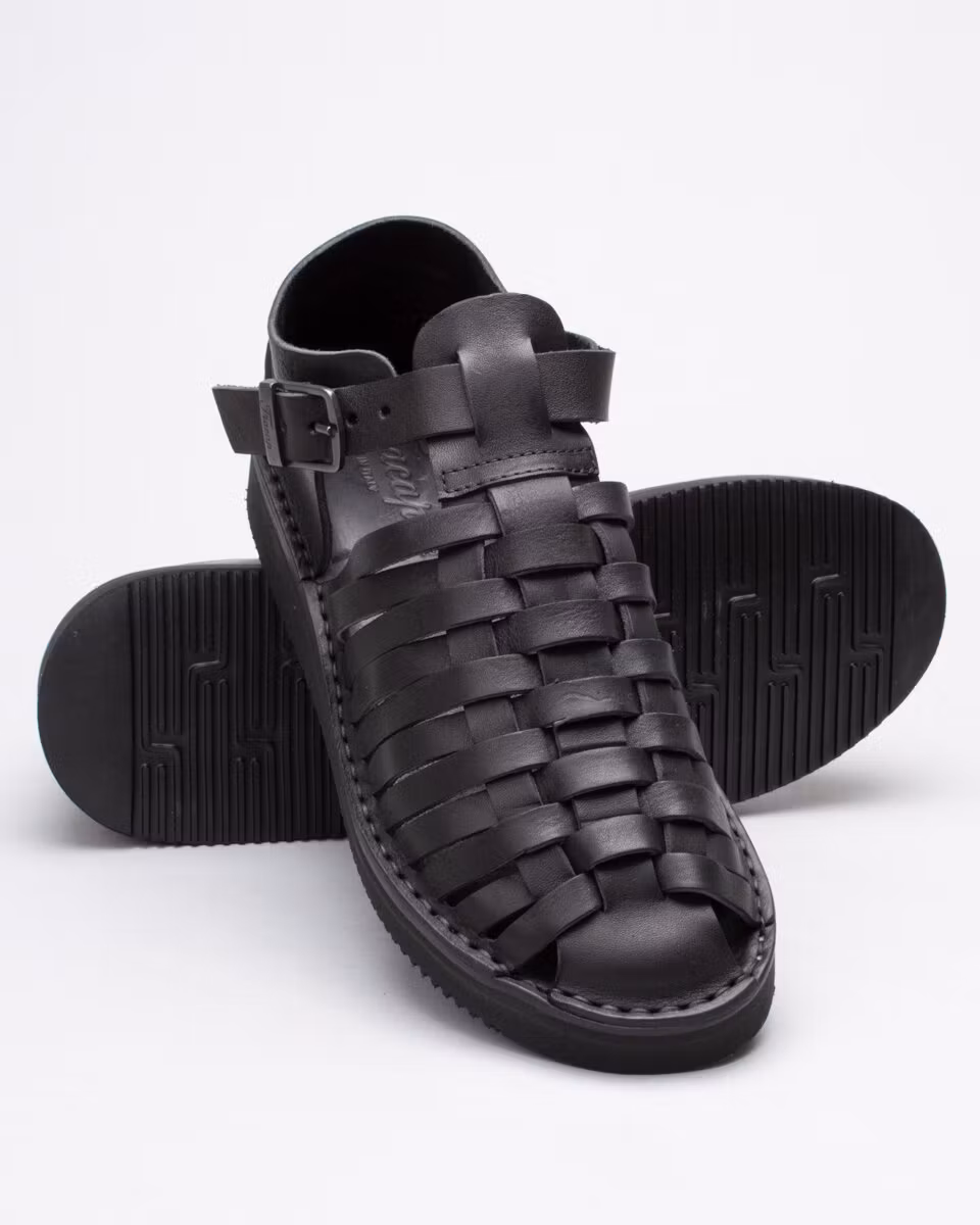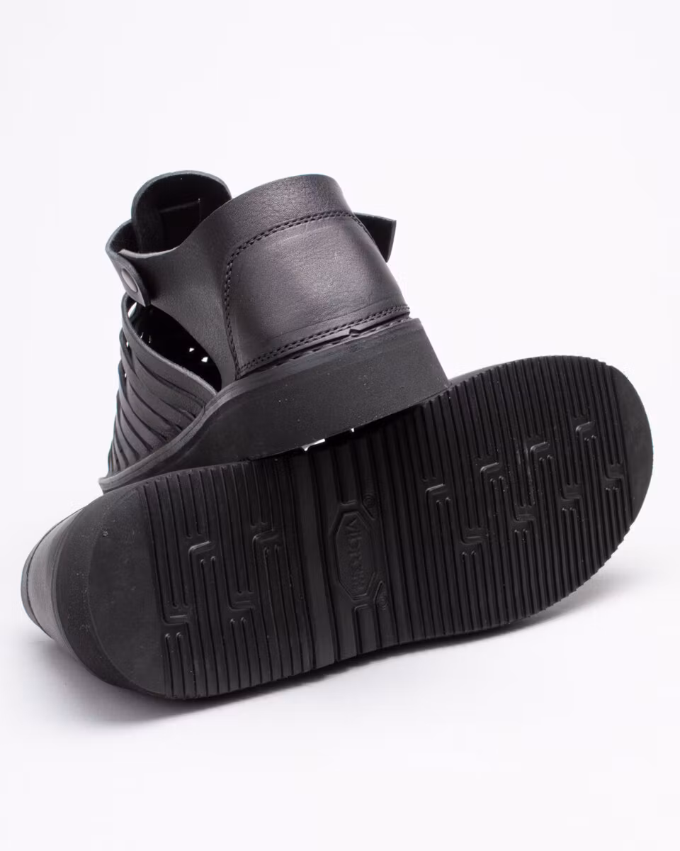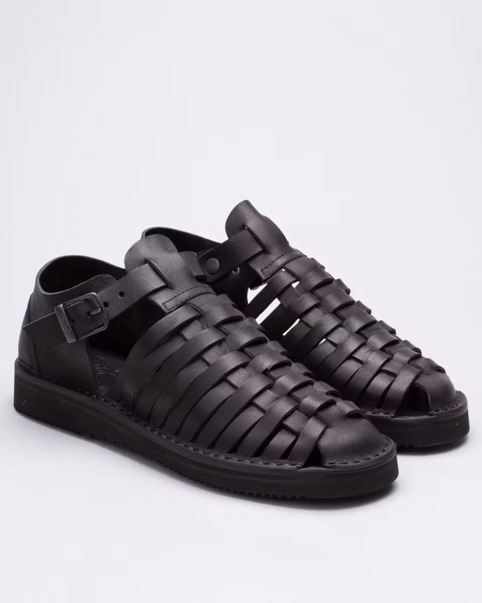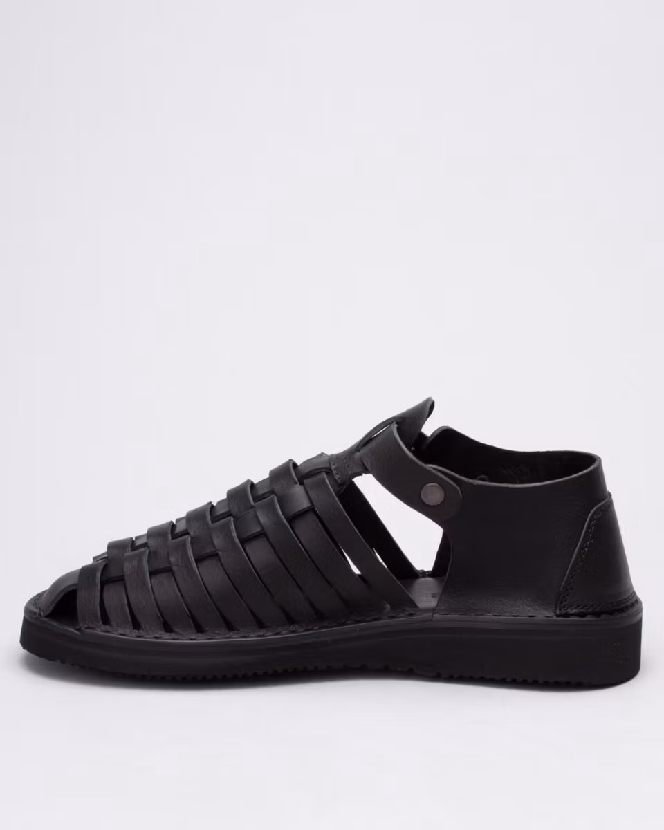 Black leather sandal from Fracap. Leather insole. Lightweight rubber outsole from Vibram. Stitched Down construction. Resoleable. Made in Italy.