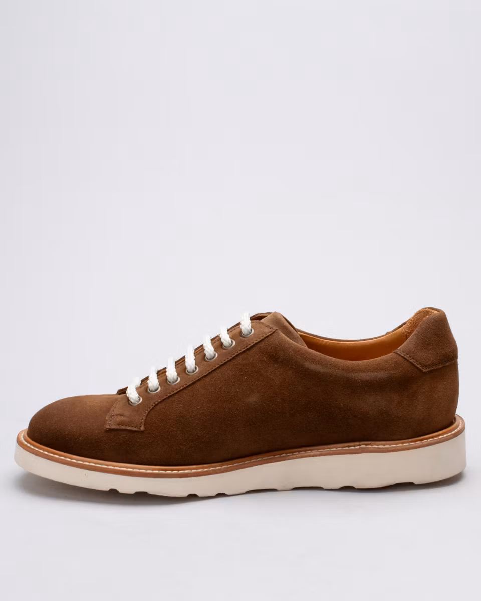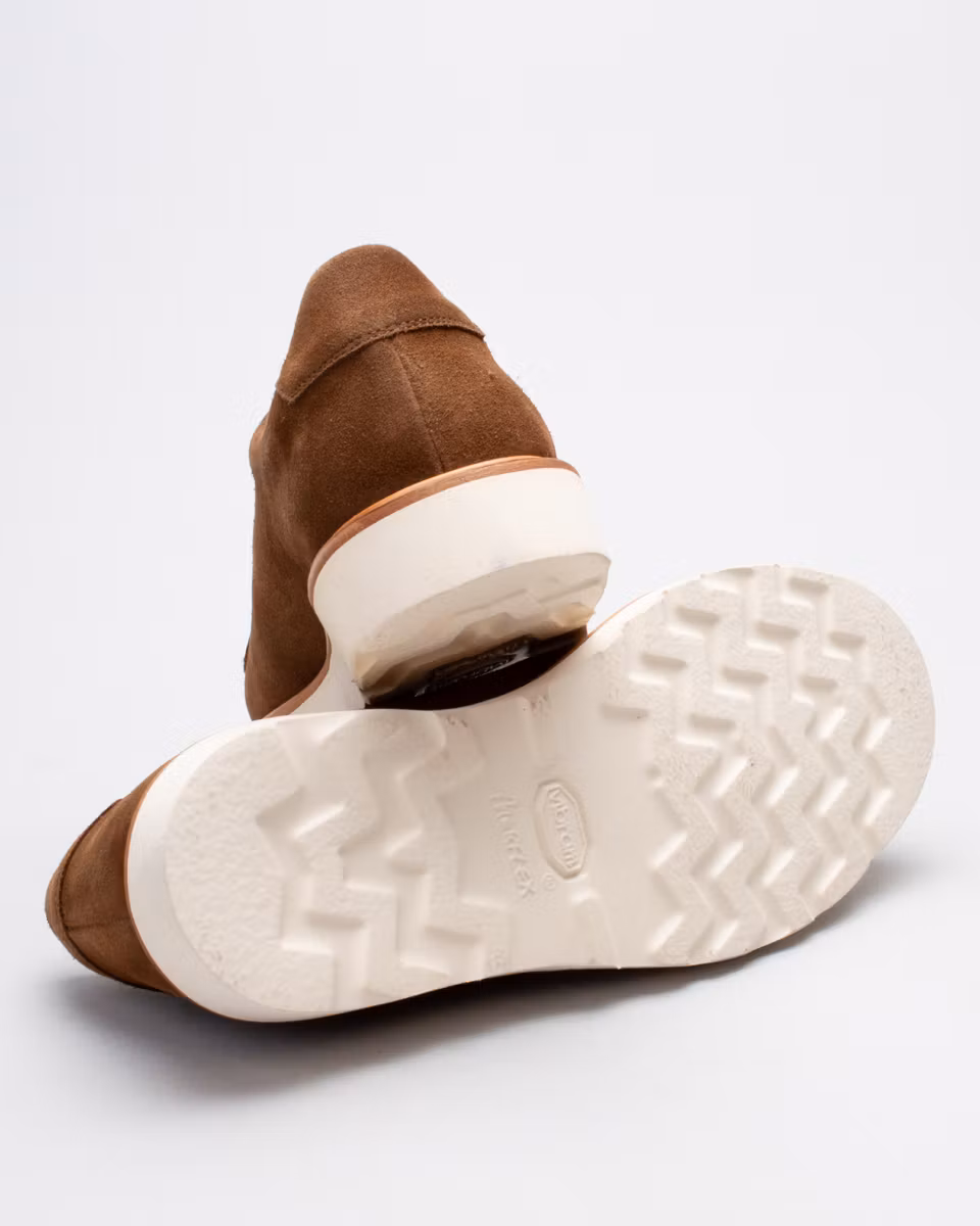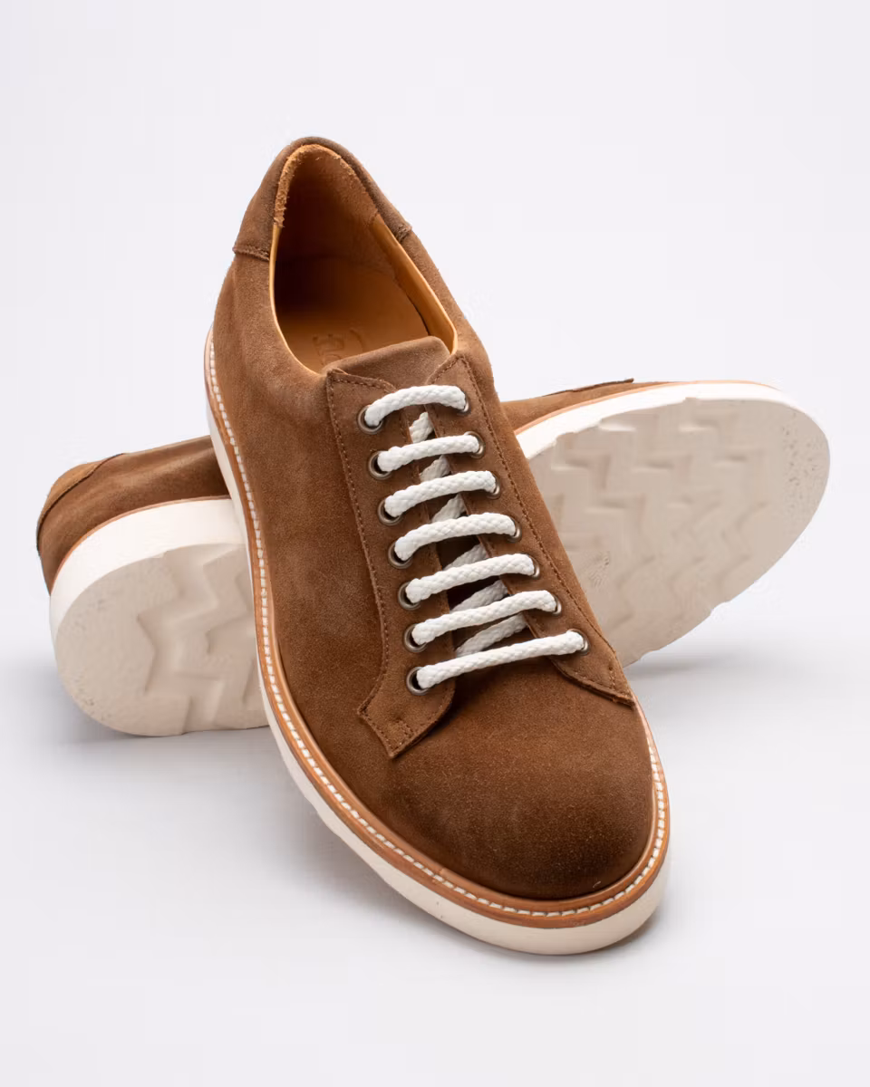 Sneaker hybrid from Fiddler. Upper in brown suede. Full leather lining. Leather insole. Morflex lightweight rubber outsole from Vibram. Cemented construction. Made in Spain.