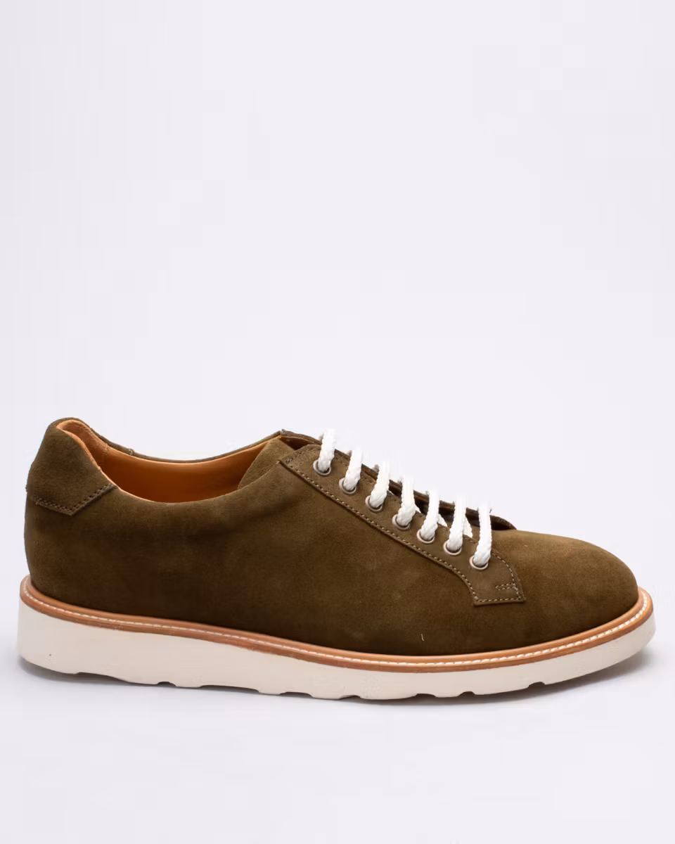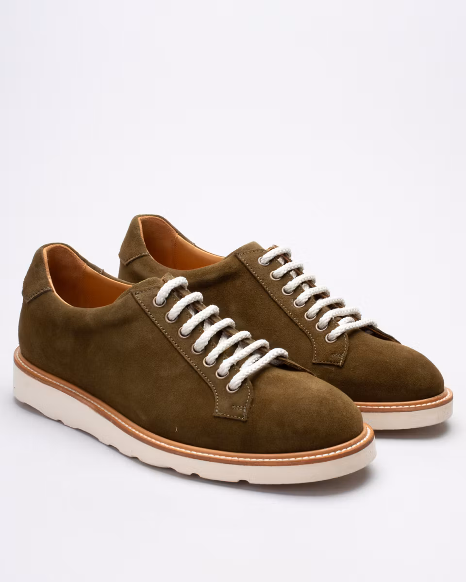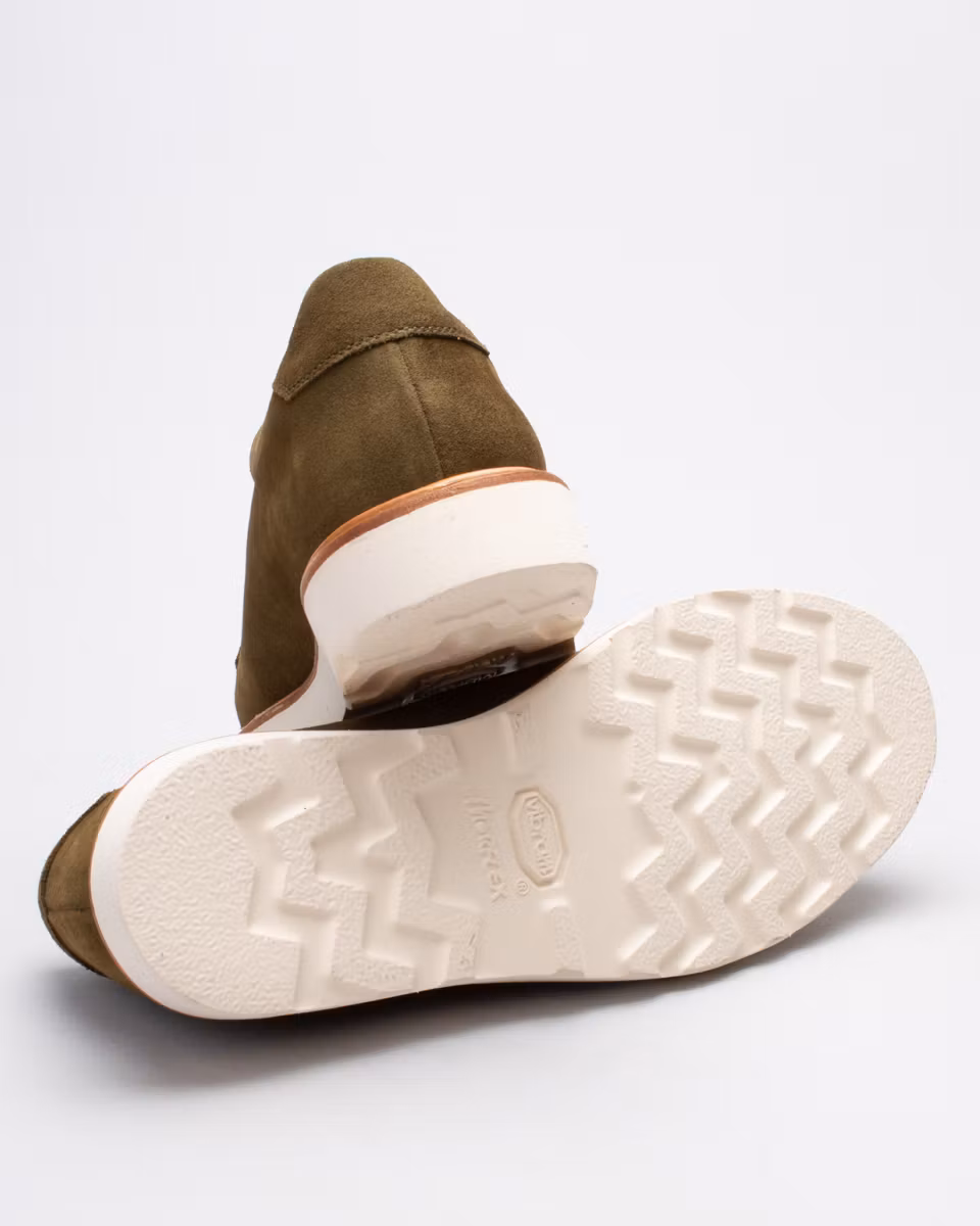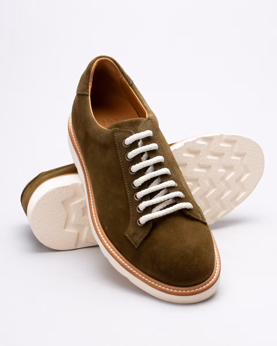 Sneaker hybrid from Fiddler. Upper in moss green suede. Full leather lining. Leather insole. Morflex lightweight rubber outsole from Vibram. Cemented construction. Made in Spain.