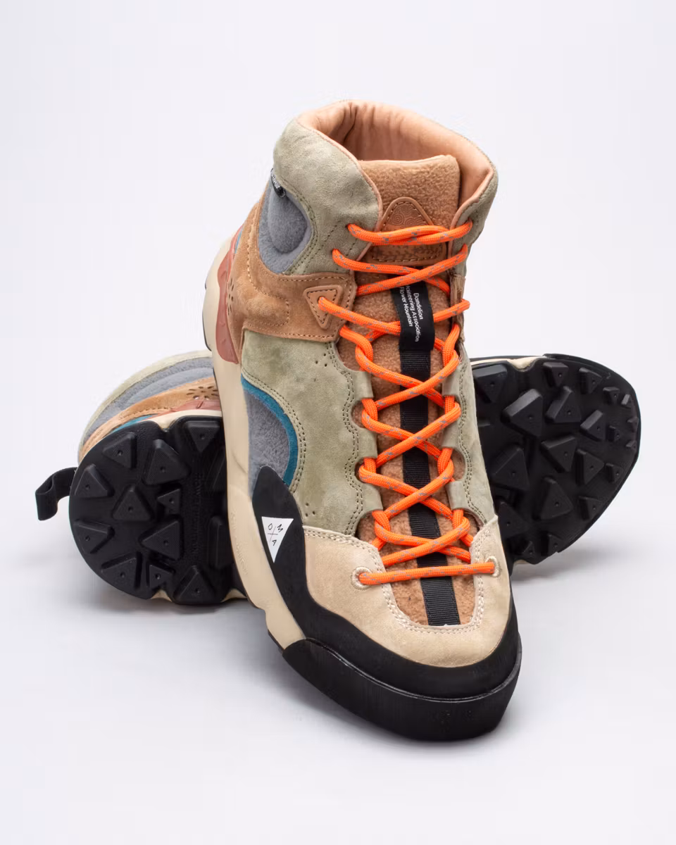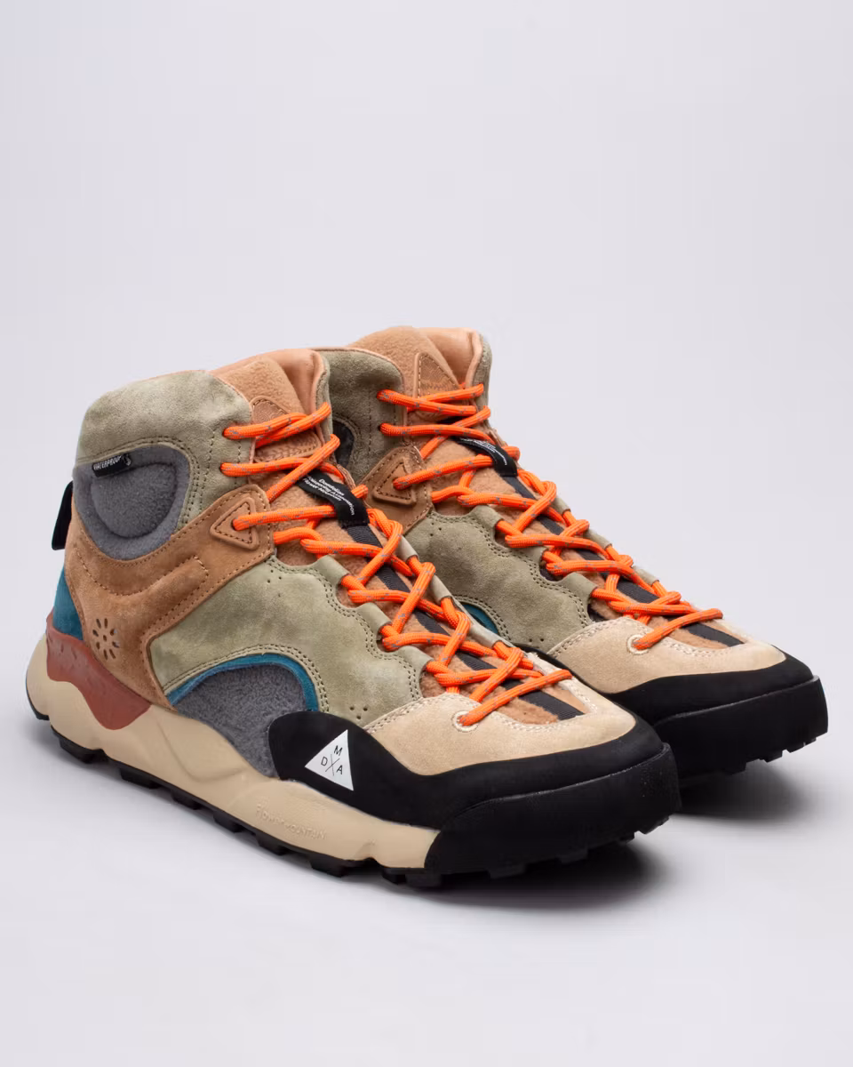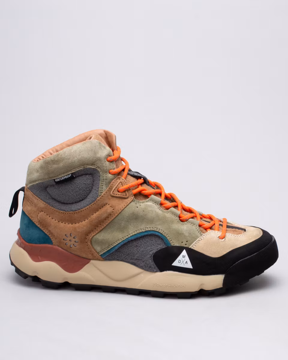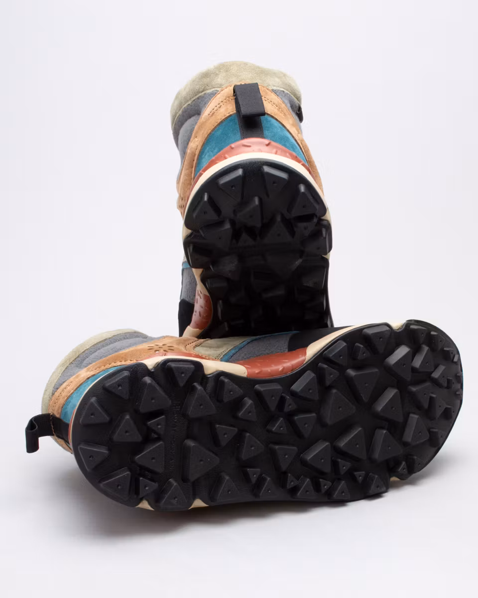 Mid-top sneakers designed for outdoor activities. Upper in suede and water-repellent fleece. Waterproof with heat-sealed seams. Ribbed sole. Natural antibacterial cork insole. Rugged-patterned rubber outsole for optimal traction in any situation.