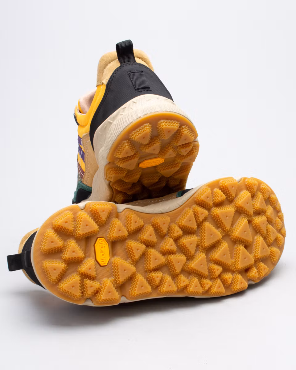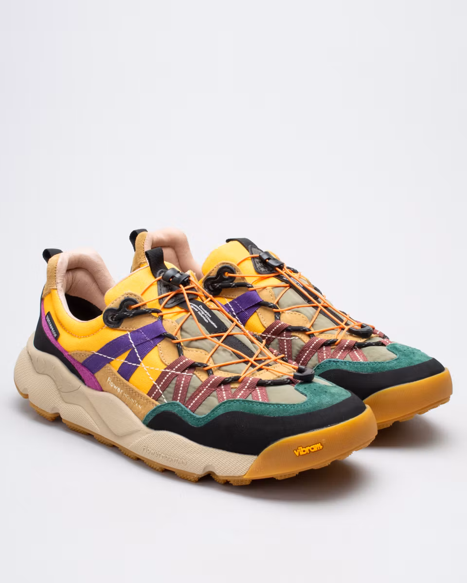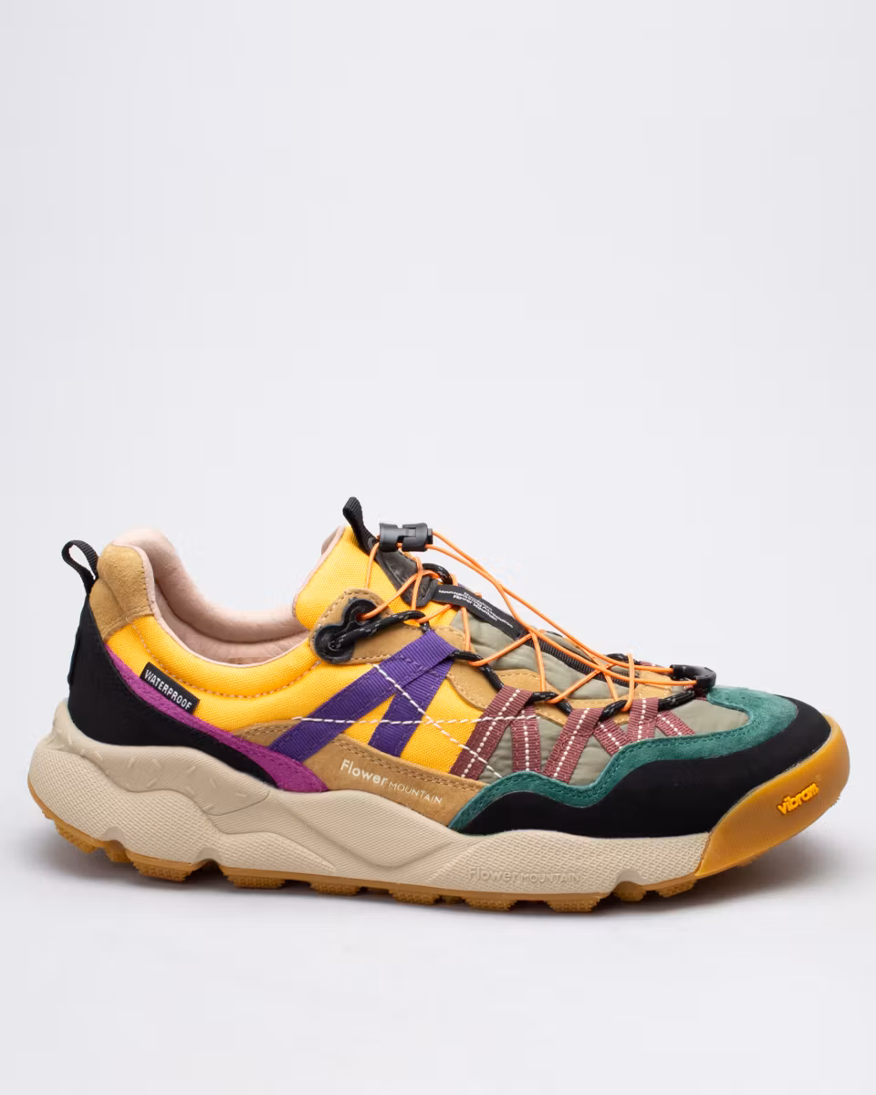 Iwano hiking shoe from Japanese brand Flower Mountain. The technical fabric upper features suede accents with the signature overlapping construction. Waterproof membrane ensures comfort in all situations. The model is equipped with technical laces with quick-lock for easy on and off. Natural antibacterial cork insole. Vibram® Megagrip rubber outsole for optimal traction in any situation.
