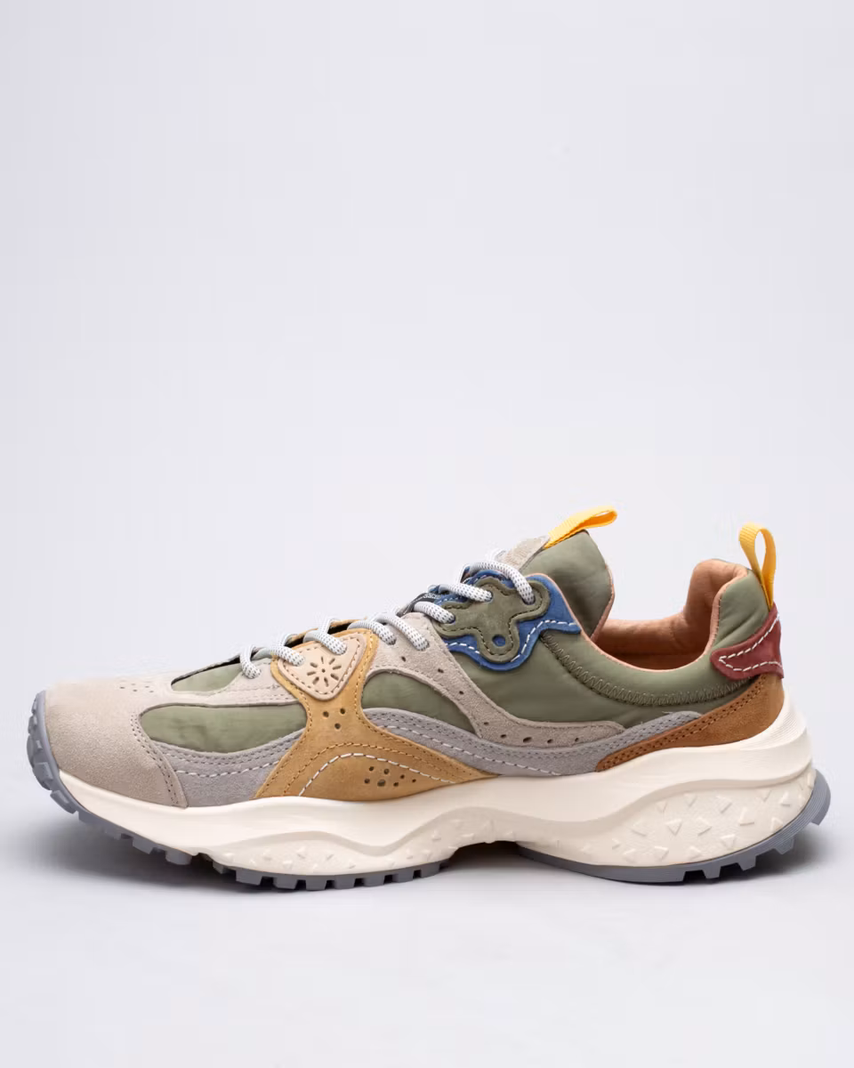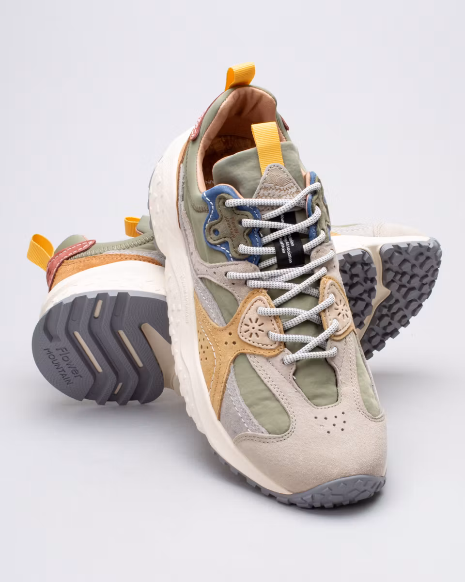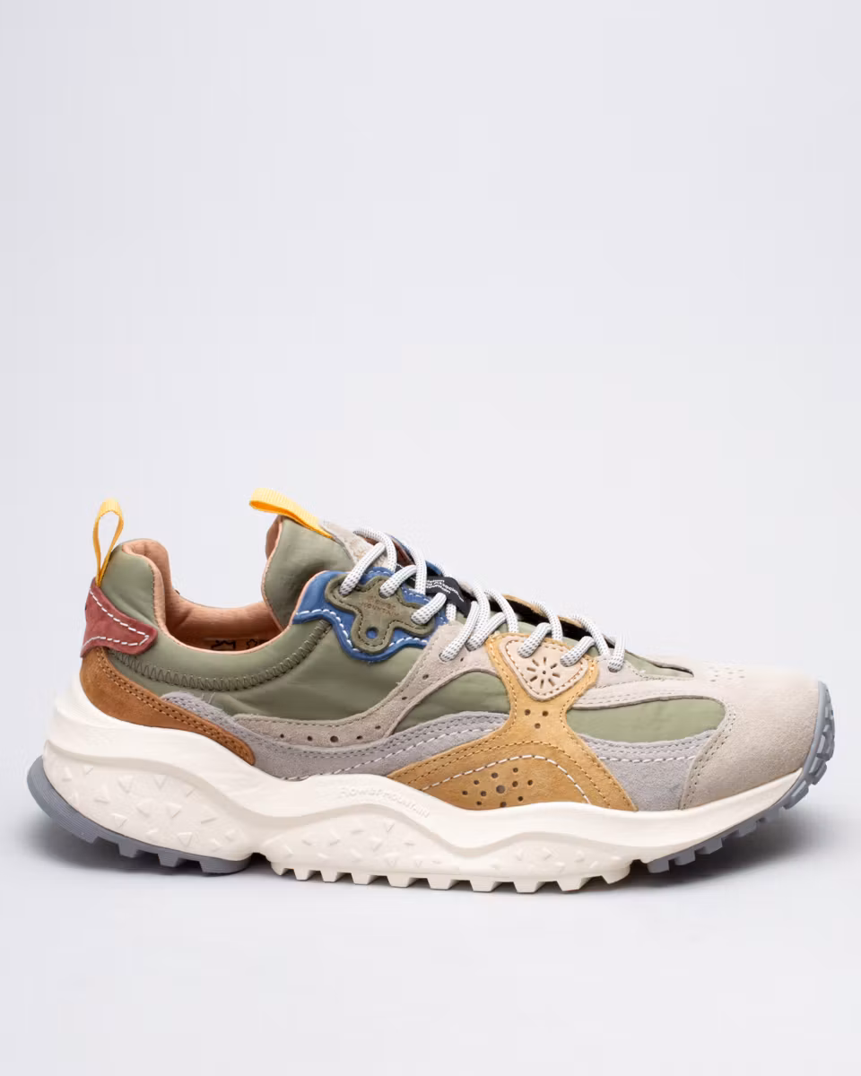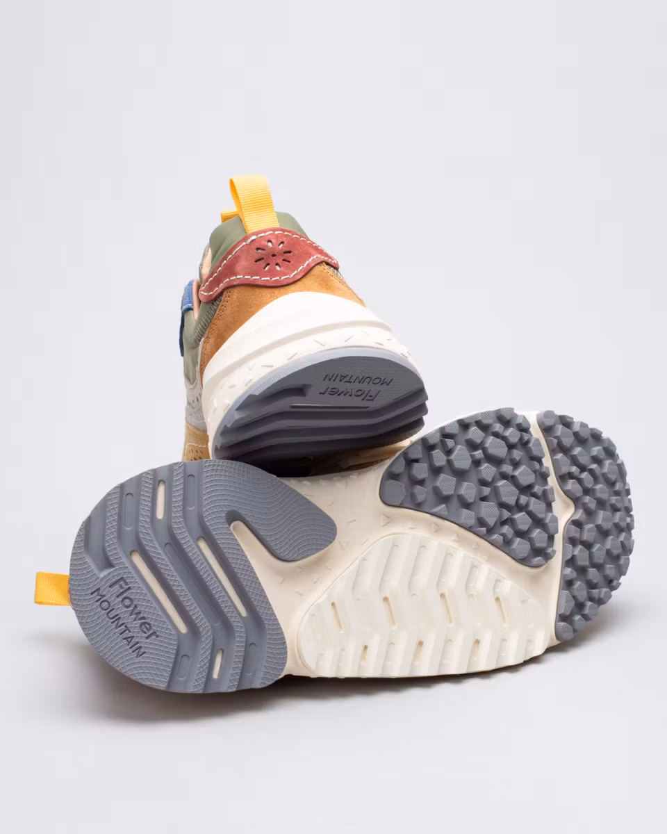 Sporty sneaker from Japanese Flower Mountain, model Wave. Upper in technical fabric with suede details. Leather-lined heel section. Antibacterial insole in natural cork. Moulded, ultra-light rubber outsole with contrasting details.
