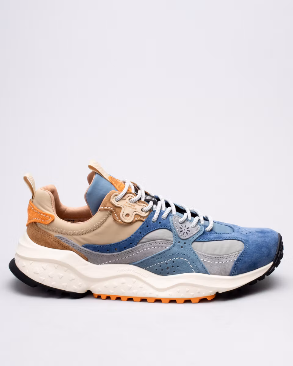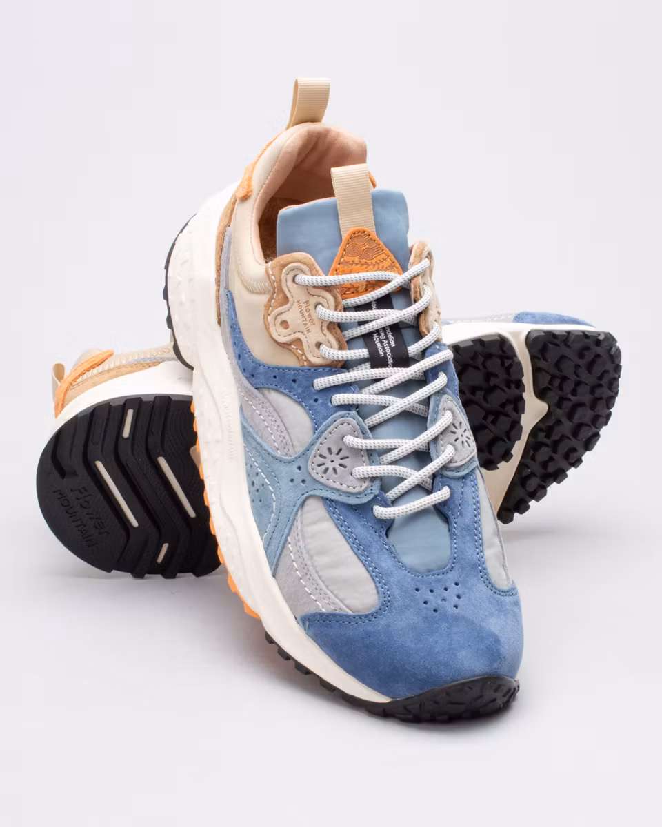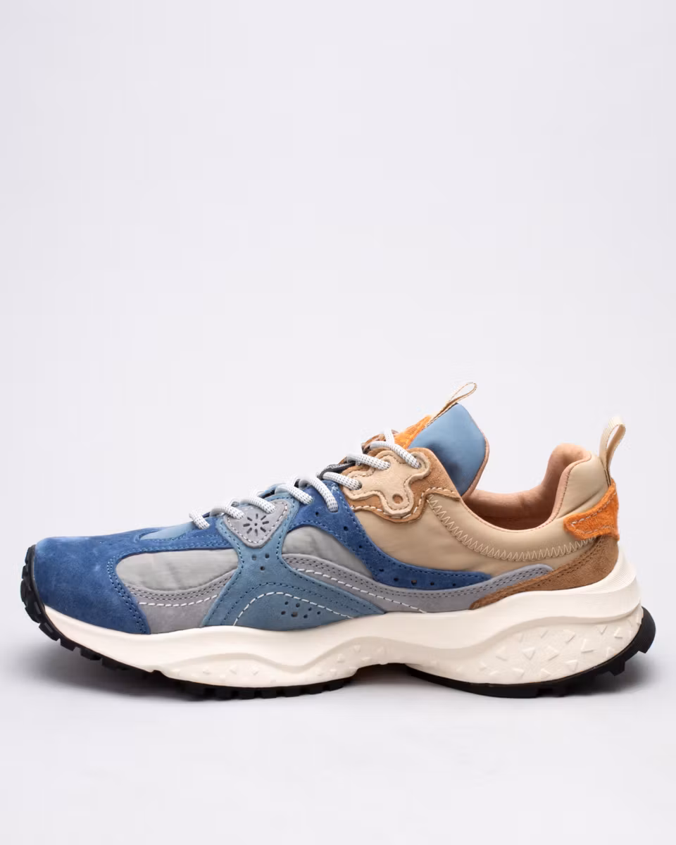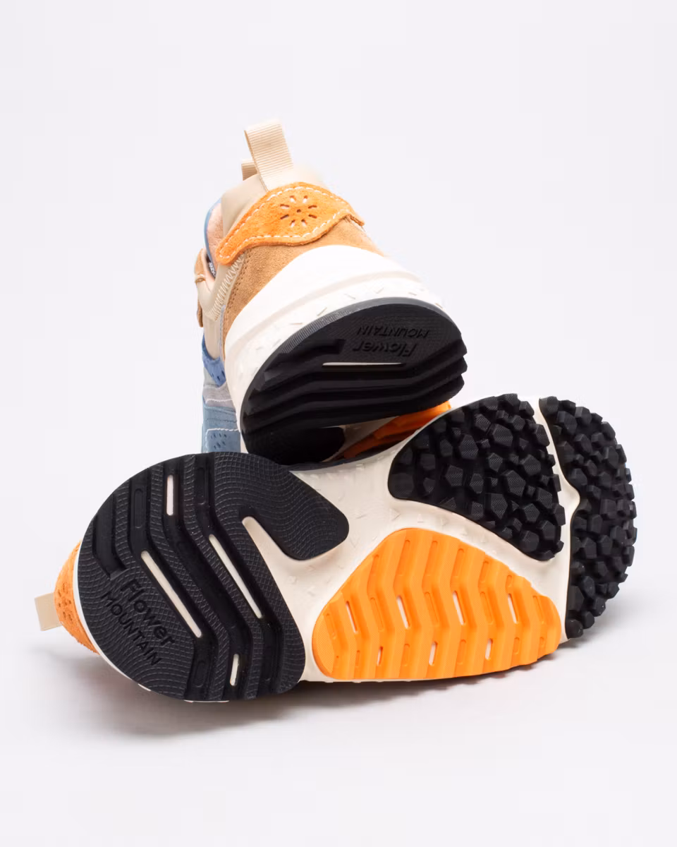 Sporty sneaker from Japanese Flower Mountain, model Wave. Upper in two-tone technical fabric with suede details. Leather-lined heel section. Antibacterial insole in natural cork. Moulded, ultra-light rubber outsole with contrasting details.