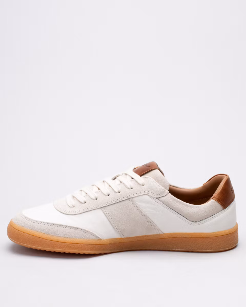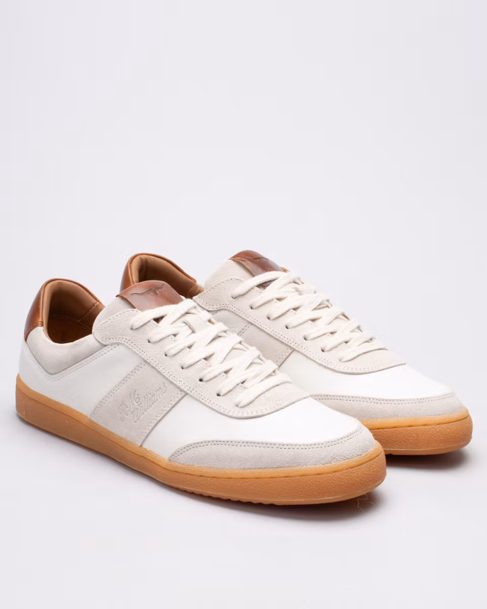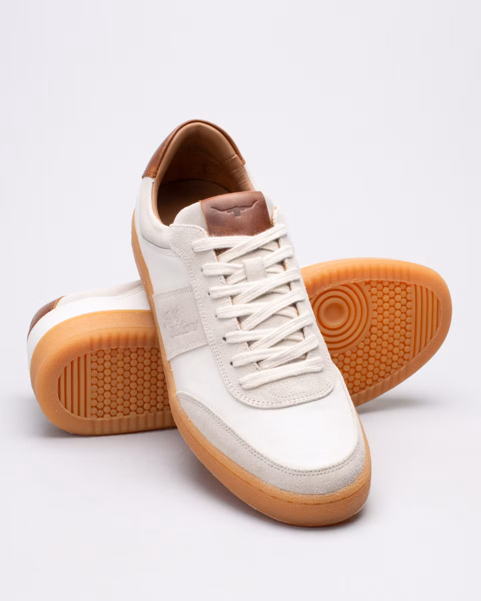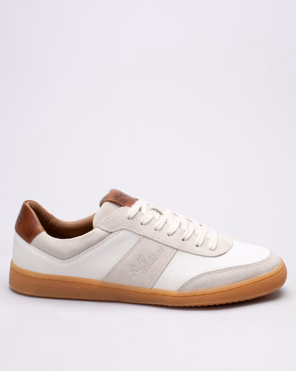 Sneakers from R.M. Williams. Upper in white calf leather with grey suede detailing. Fully leather lined. Removable, leather-lined insole. Rubber outsole. Made in Portugal.