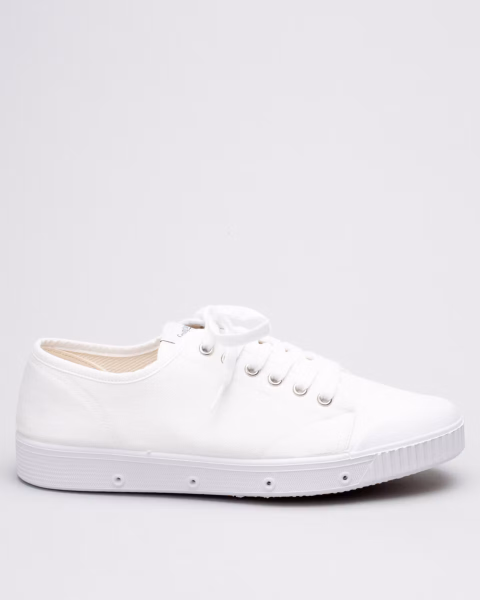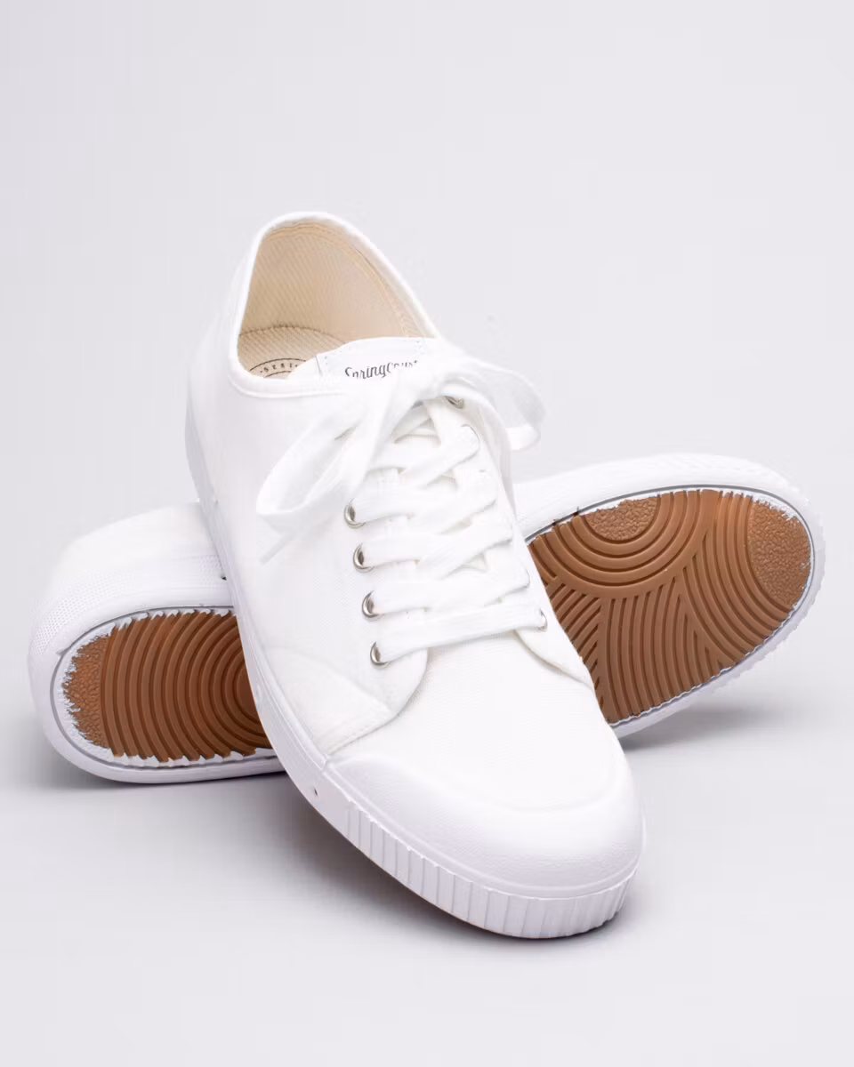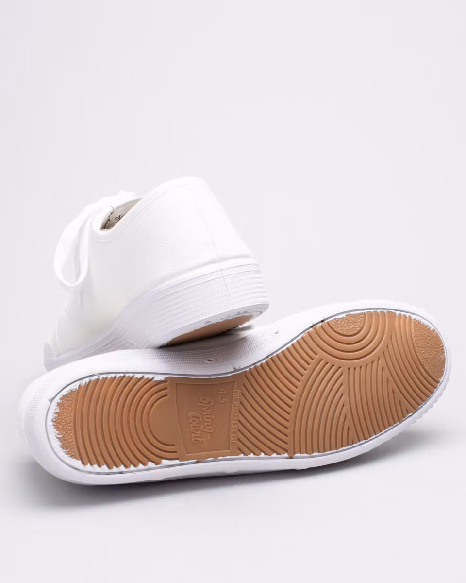 The classic tennis shoe from Spring Court, entirely in white. Canvas upper, comfortable insole in silicone, outsole in latex. Ventilated through the 4 holes in the outsole. Proberbly the best canvas shoe in the world...
