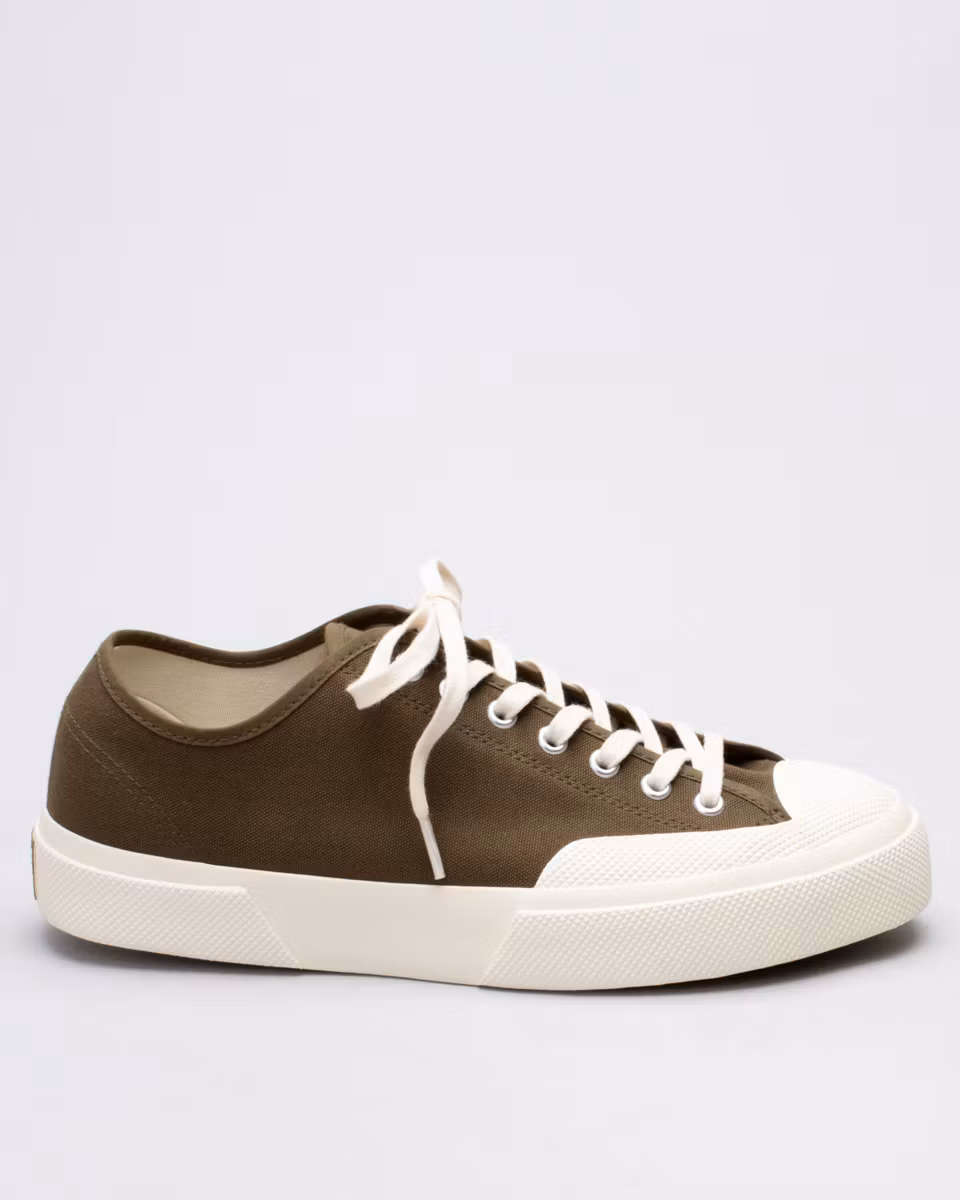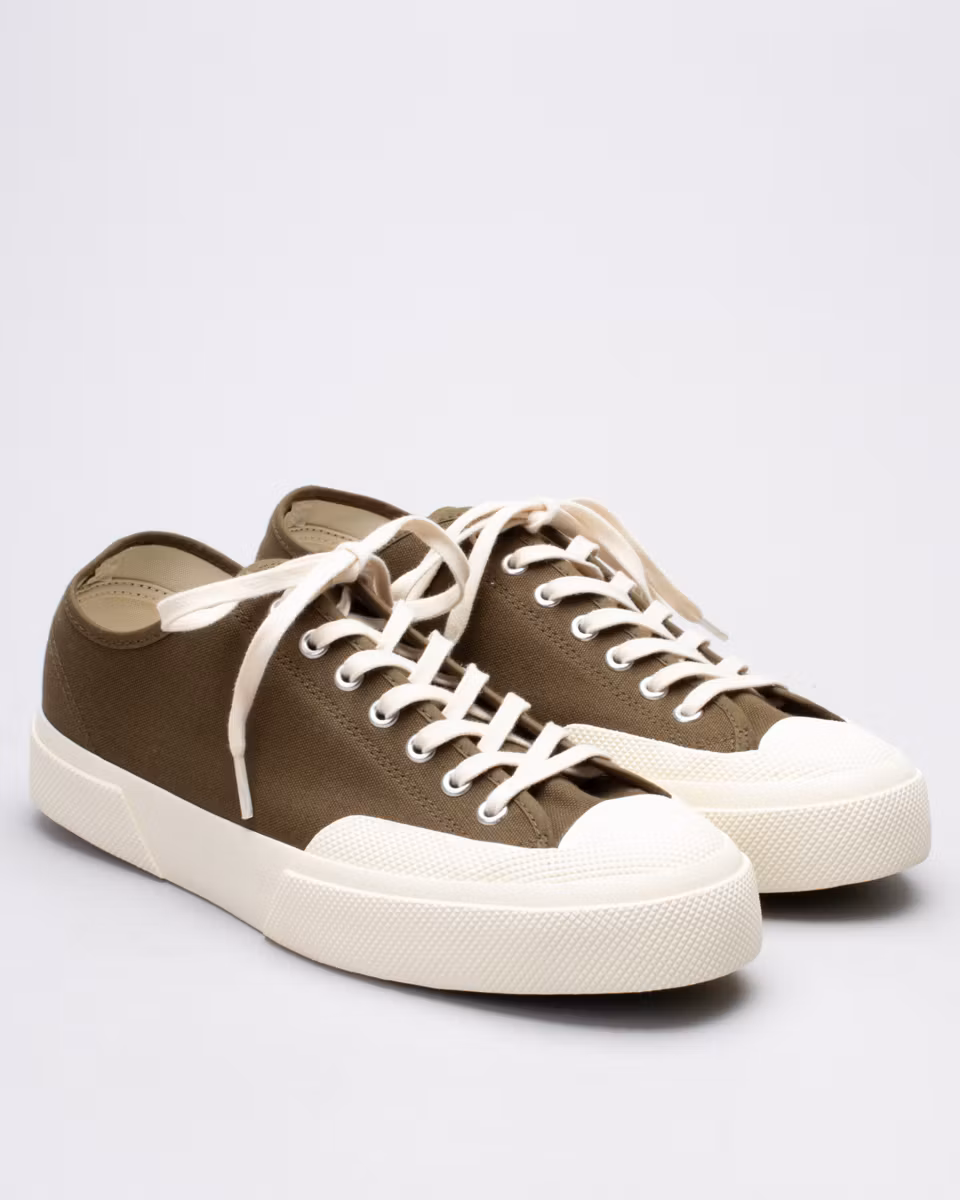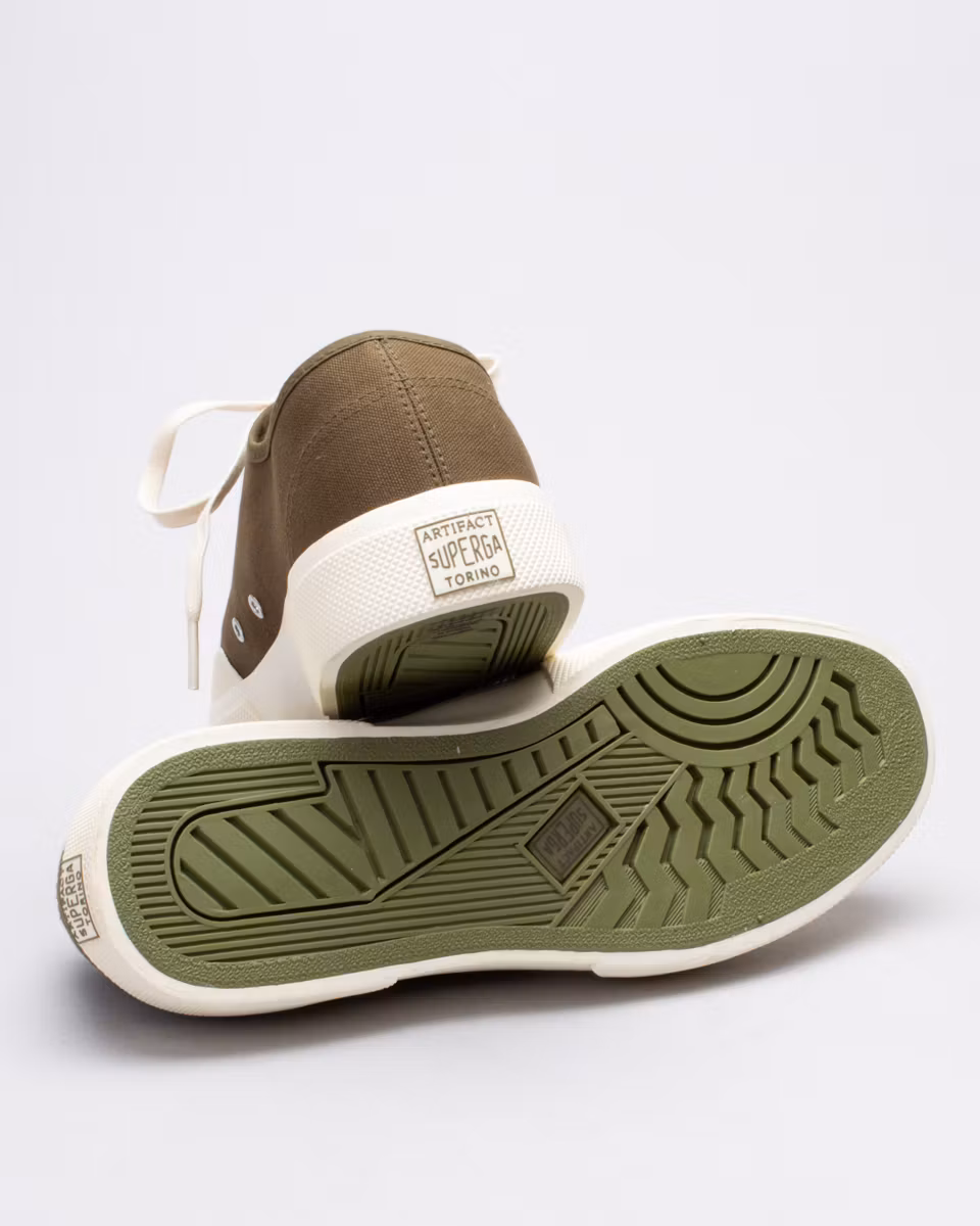 Classic tennis shoe silhouette from the Italian brand Superga. The Artifact collection has been developed in collaboration with the Japanese designer Teppei Sugaya, combining European design with Japanese materials. Upper in olive green twill. Vulcanised rubber outsole.