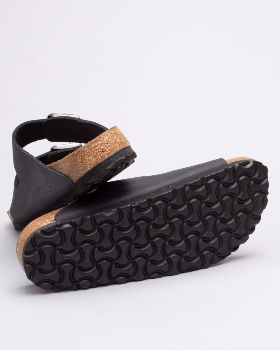 Birkenstock's classic two-strap sandal. Upper in black premium leather. Leather and cork footbed. Rubber outsole. Narrow fit. Made in Germany.