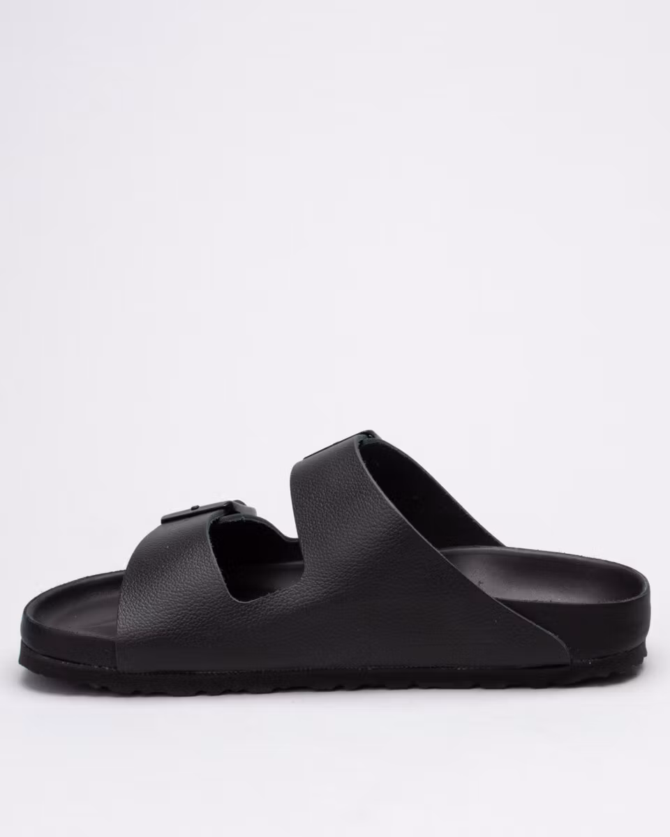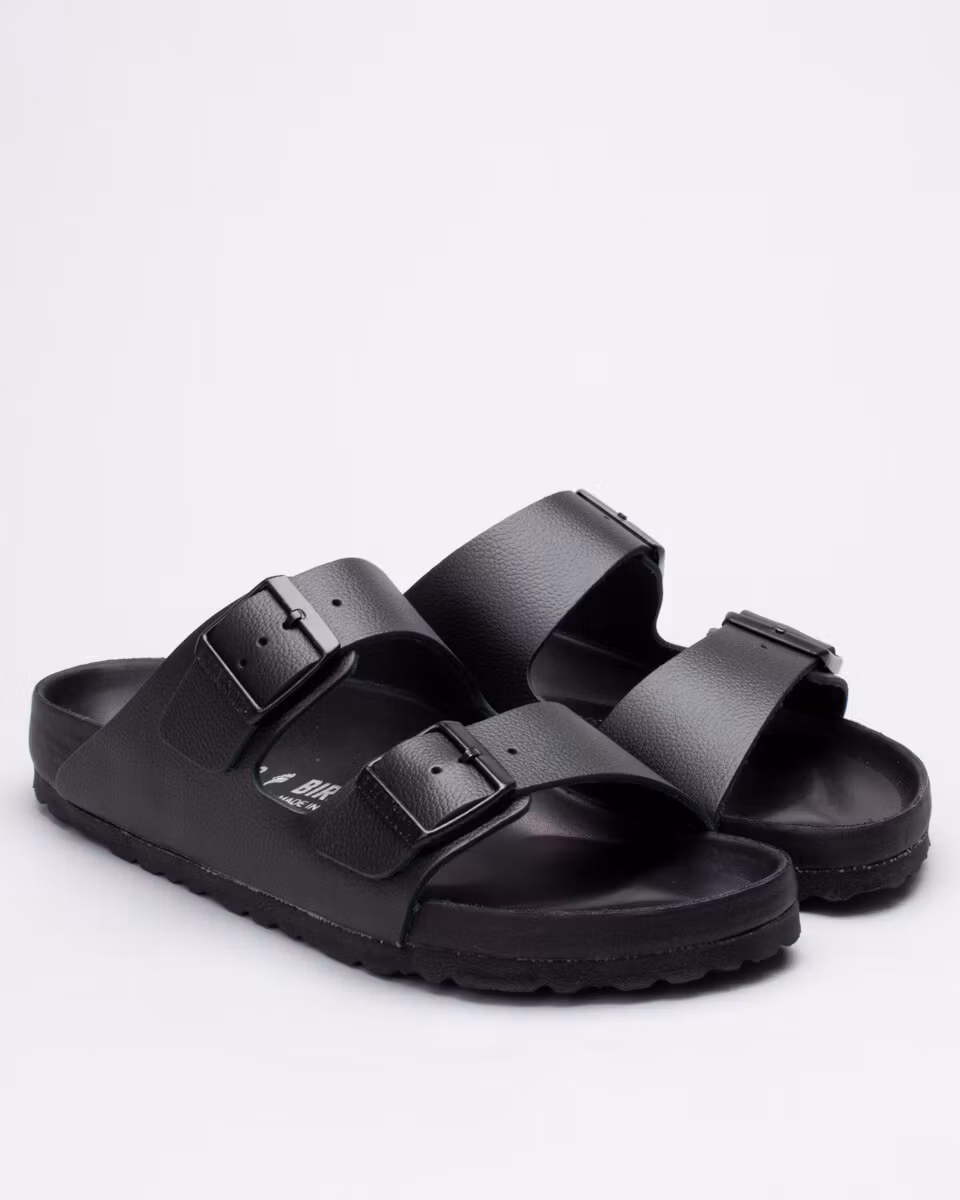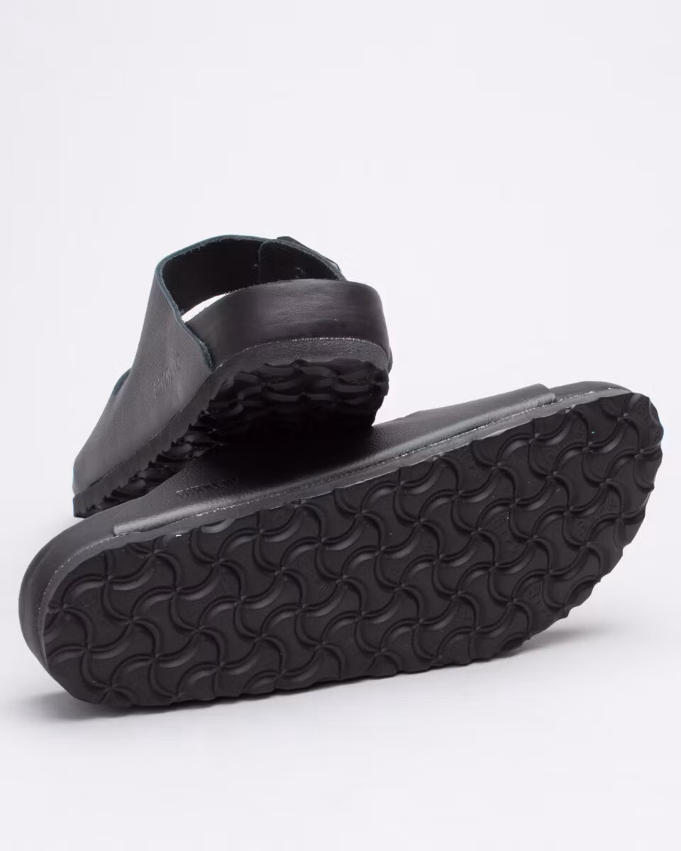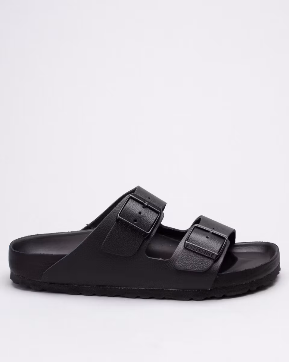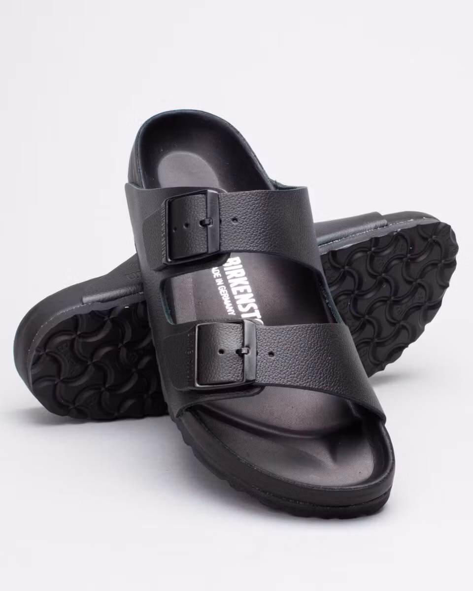 The Arizona is the classic 2-strap sandal from Birkenstock in premium version with leather embedded sole. Leather insole. Natural cork, soft footbed. EVA rubber outsole. All black. Narrow width. Made in Germany.