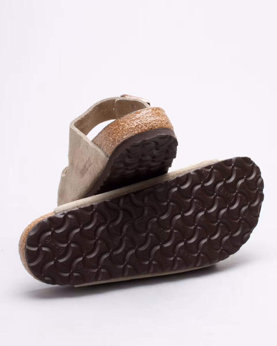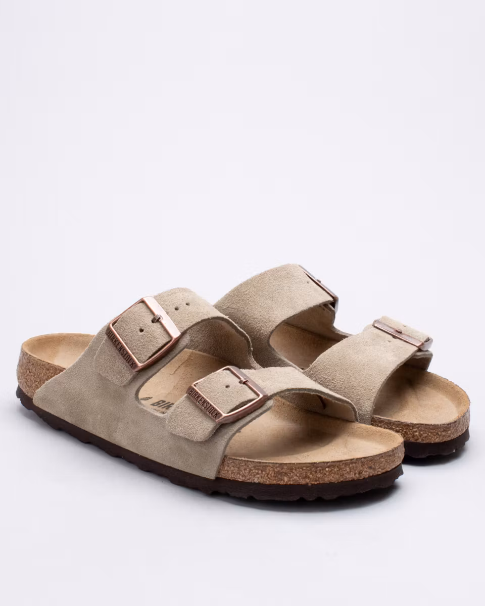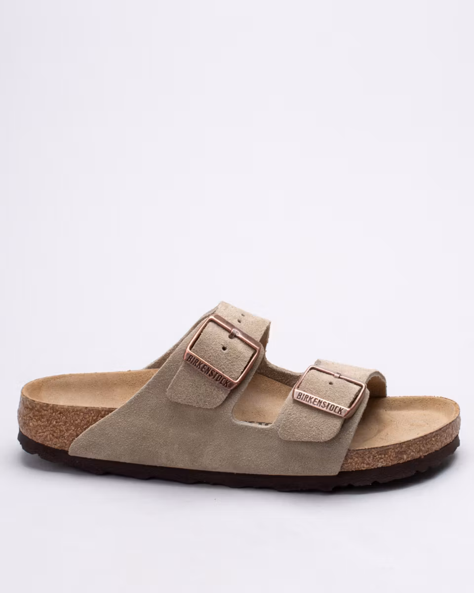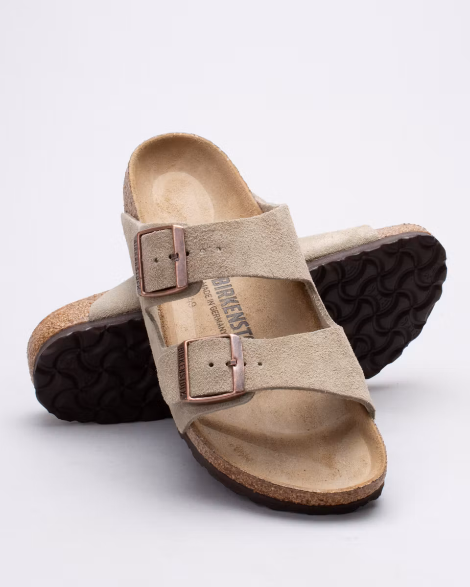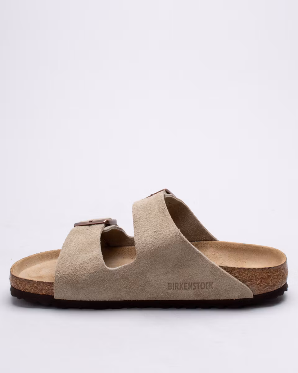 The Arizona is the classic 2-strap sandal from Birkenstock. Upper in taupe suede. Leather insole. Natural cork footbed. EVA rubber outsole. Narrow width. Made in Germany.